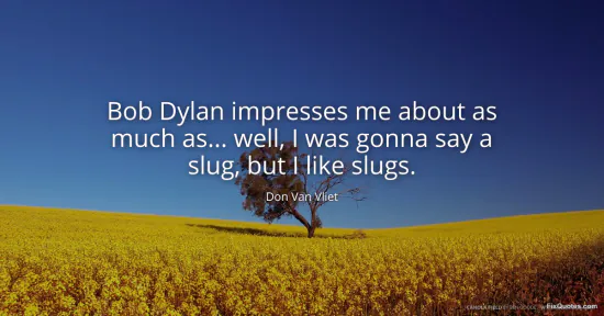 Vliet, Don Van. "Bob Dylan impresses me about as much as... well, I was gonna say a slug, but I like slugs." FixQuotes. February 16, 2026. https://fixquotes.com/quotes/bob-dylan-impresses-me-about-as-much-as-well-i-52589/.