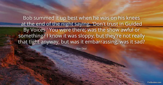 Deal, Kim. "Bob summed it up best when he was on his knees at the end of the night saying, 'Don't trust in Guided By Voices.' You were there; was the show awful or something? I know it was sloppy, but they're not really that tight anyway, but was it embarrassing, was it sad?" FixQuotes. January 17, 2026. https://fixquotes.com/quotes/bob-summed-it-up-best-when-he-was-on-his-knees-at-54703/.