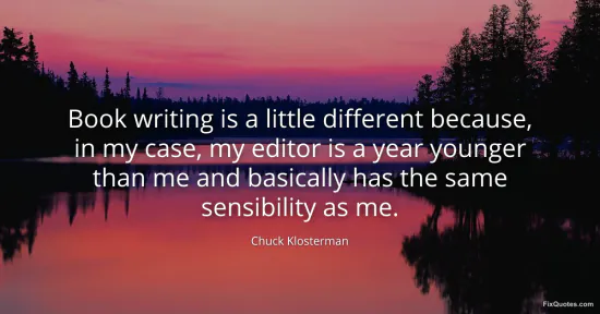 Klosterman, Chuck. (2026, January 15). Book writing is a little different because, in my case, my editor is a year younger than me and basically has the same sensibility as me. FixQuotes. https://fixquotes.com/quotes/book-writing-is-a-little-different-because-in-my-143351/