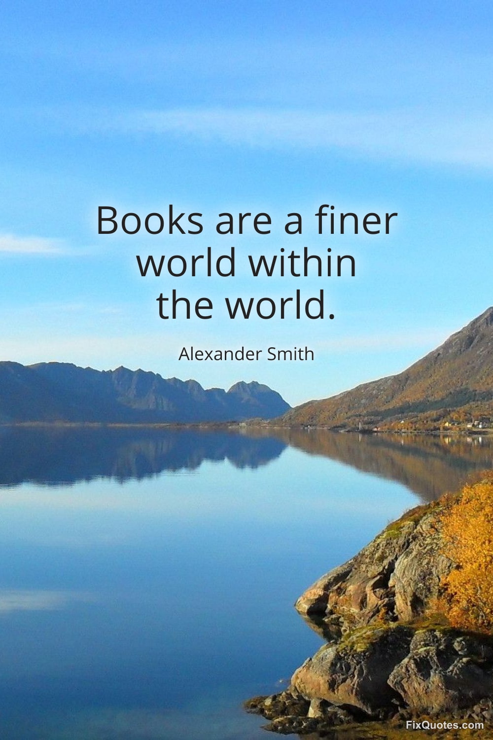 Smith, Alexander. (2026, January 18). Books are a finer world within the world. FixQuotes. https://fixquotes.com/quotes/books-are-a-finer-world-within-the-world-20967/