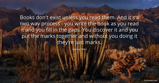 West, Samuel. (2026, January 16). Books don't exist unless you read them. And it's a two way process - you write the book as you read it and you fill in the gaps. You discover it and you put the marks together and without you doing it they're just marks. FixQuotes. https://fixquotes.com/quotes/books-dont-exist-unless-you-read-them-and-its-a-102200/