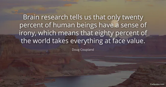 Coupland, Doug. "Brain research tells us that only twenty percent of human beings have a sense of irony, which means that eighty percent of the world takes everything at face value." FixQuotes. January 17, 2026. https://fixquotes.com/quotes/brain-research-tells-us-that-only-twenty-percent-49067/.