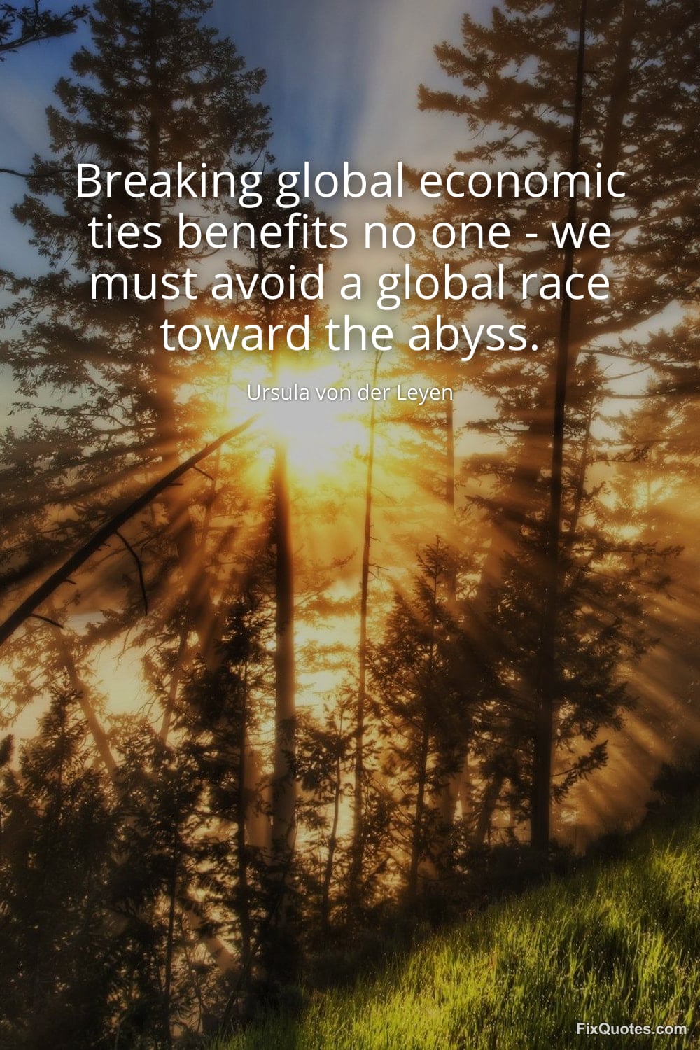 Leyen, Ursula von der. (2026, January 15). Breaking global economic ties benefits no one - we must avoid a global race toward the abyss. FixQuotes. https://fixquotes.com/quotes/breaking-global-economic-ties-benefits-no-one-173062/