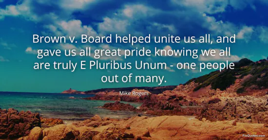 Rogers, Mike. "Brown v. Board helped unite us all, and gave us all great pride knowing we all are truly E Pluribus Unum - one people out of many." FixQuotes. January 15, 2026. https://fixquotes.com/quotes/brown-v-board-helped-unite-us-all-and-gave-us-all-93865/.