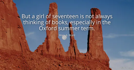 Ward, Mary A. (2026, January 17). But a girl of seventeen is not always thinking of books, especially in the Oxford summer term. FixQuotes. https://fixquotes.com/quotes/but-a-girl-of-seventeen-is-not-always-thinking-of-74621/