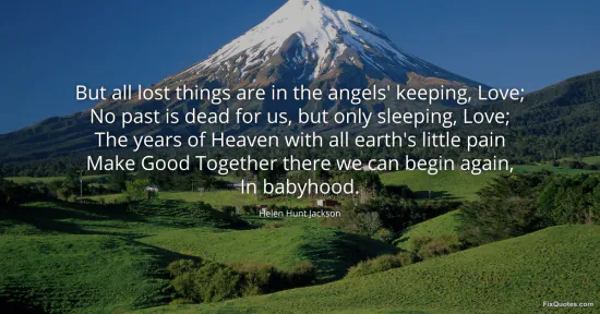 Jackson, Helen Hunt. "But all lost things are in the angels' keeping, Love; No past is dead for us, but only sleeping, Love; The years of Heaven with all earth's little pain Make Good Together there we can begin again, In babyhood." FixQuotes. January 17, 2026. https://fixquotes.com/quotes/but-all-lost-things-are-in-the-angels-keeping-59196/.