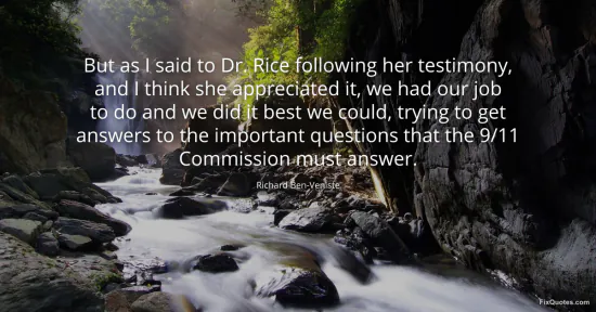 Ben-Veniste, Richard. "But as I said to Dr. Rice following her testimony, and I think she appreciated it, we had our job to do and we did it best we could, trying to get answers to the important questions that the 9/11 Commission must answer." FixQuotes. January 16, 2026. https://fixquotes.com/quotes/but-as-i-said-to-dr-rice-following-her-testimony-85742/.