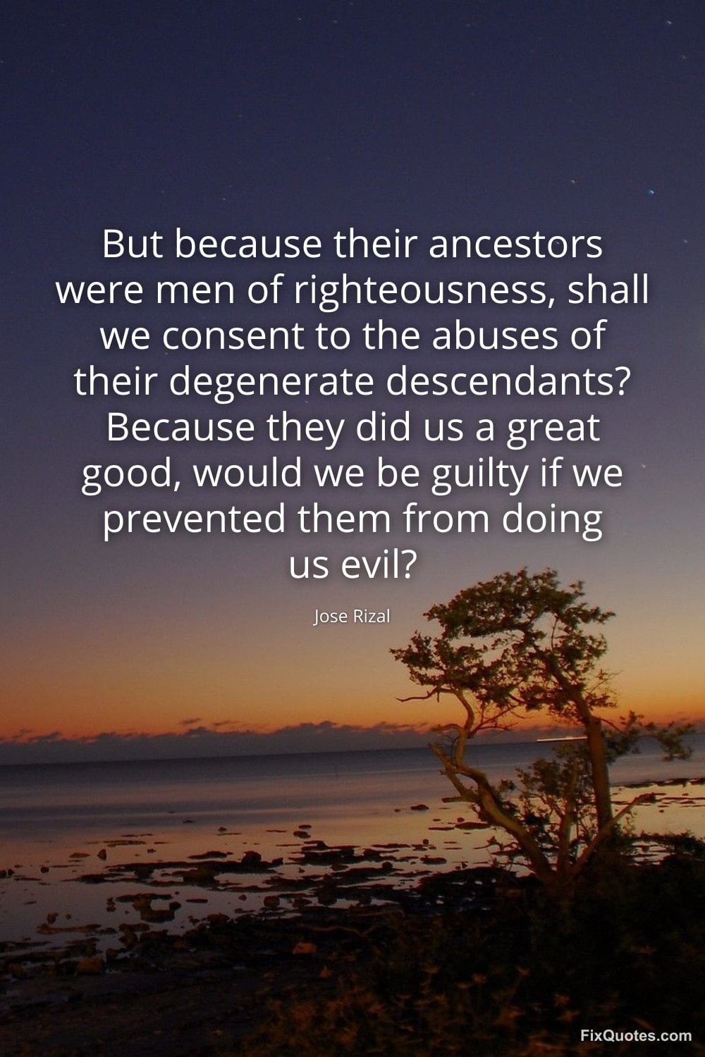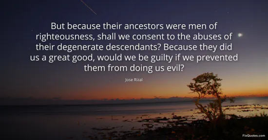 Rizal, Jose. "But because their ancestors were men of righteousness, shall we consent to the abuses of their degenerate descendants? Because they did us a great good, would we be guilty if we prevented them from doing us evil?" FixQuotes. February 10, 2026. https://fixquotes.com/quotes/but-because-their-ancestors-were-men-of-185104/.