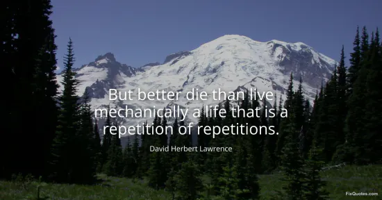 Lawrence, David Herbert. (2026, January 18). But better die than live mechanically a life that is a repetition of repetitions. FixQuotes. https://fixquotes.com/quotes/but-better-die-than-live-mechanically-a-life-that-6483/