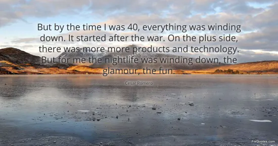 Romero, Cesar. (2026, January 17). But by the time I was 40, everything was winding down. It started after the war. On the plus side, there was more more products and technology. But for me the nightlife was winding down, the glamour, the fun. FixQuotes. https://fixquotes.com/quotes/but-by-the-time-i-was-40-everything-was-winding-44548/