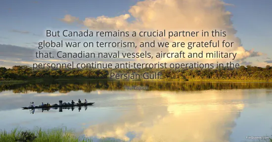 Cellucci, Paul. (2026, January 16). But Canada remains a crucial partner in this global war on terrorism, and we are grateful for that. Canadian naval vessels, aircraft and military personnel continue anti-terrorist operations in the Persian Gulf. FixQuotes. https://fixquotes.com/quotes/but-canada-remains-a-crucial-partner-in-this-85207/