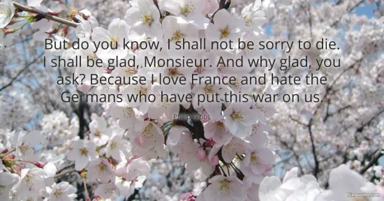 "But do you know, I shall not be sorry to die. I shall be glad, Monsieur. And why glad, you ask? Because I love France and hate the Germans who have put this war on us." FixQuotes, 16 Jan. 2026, https://fixquotes.com/quotes/but-do-you-know-i-shall-not-be-sorry-to-die-i-91430/. Accessed 9 Feb. 2026.