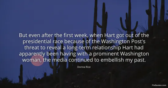 Rice, Donna. (2026, January 17). But even after the first week, when Hart got out of the presidential race because of the Washington Post's threat to reveal a long-term relationship Hart had apparently been having with a prominent Washington woman, the media continued to embellish my past. FixQuotes. https://fixquotes.com/quotes/but-even-after-the-first-week-when-hart-got-out-43038/