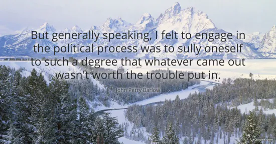 Barlow, John Perry. "But generally speaking, I felt to engage in the political process was to sully oneself to such a degree that whatever came out wasn't worth the trouble put in." FixQuotes. January 15, 2026. https://fixquotes.com/quotes/but-generally-speaking-i-felt-to-engage-in-the-151611/.