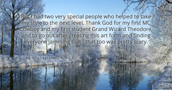 Flash, Grandmaster. (2026, January 17). But I had two very special people who helped to take my style to the next level. Thank God for my first MC Cowboy and my first student Grand Wizard Theodore, and to go out after creating this art form and finding everyone jamming to it - that too was pretty scary. FixQuotes. https://fixquotes.com/quotes/but-i-had-two-very-special-people-who-helped-to-67040/