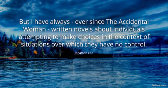 Coe, Jonathan. (2026, January 17). But I have always - ever since The Accidental Woman - written novels about individuals attempting to make choices in the context of situations over which they have no control. FixQuotes. https://fixquotes.com/quotes/but-i-have-always-ever-since-the-accidental-79916/