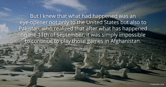 Brahimi, Lakhdar. (2026, January 16). But I knew that what had happened was an eye-opener not only to the United States but also to Pakistan, who realized that after what has happened on the 11th of September, it was simply impossible to continue to play those games in Afghanistan. FixQuotes. https://fixquotes.com/quotes/but-i-knew-that-what-had-happened-was-an-118942/
