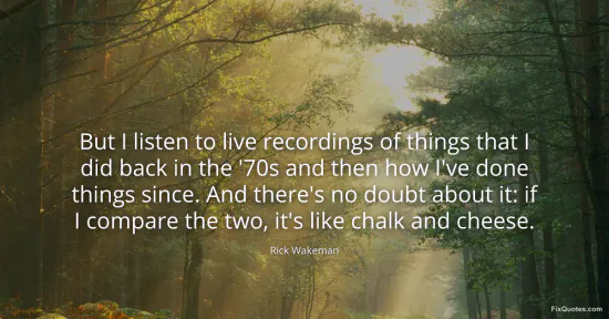 Wakeman, Rick. "But I listen to live recordings of things that I did back in the '70s and then how I've done things since. And there's no doubt about it: if I compare the two, it's like chalk and cheese." FixQuotes. January 17, 2026. https://fixquotes.com/quotes/but-i-listen-to-live-recordings-of-things-that-i-77004/.