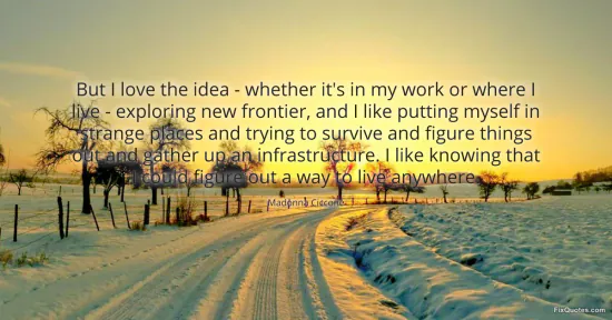 Ciccone, Madonna. (2026, January 16). But I love the idea - whether it's in my work or where I live - exploring new frontier, and I like putting myself in strange places and trying to survive and figure things out and gather up an infrastructure. I like knowing that I could figure out a way to live anywhere. FixQuotes. https://fixquotes.com/quotes/but-i-love-the-idea-whether-its-in-my-work-or-93071/