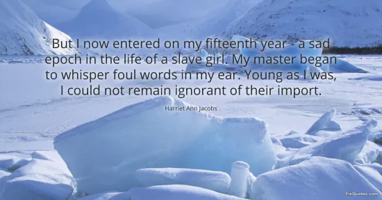 Jacobs, Harriet Ann. "But I now entered on my fifteenth year - a sad epoch in the life of a slave girl. My master began to whisper foul words in my ear. Young as I was, I could not remain ignorant of their import." FixQuotes. January 15, 2026. https://fixquotes.com/quotes/but-i-now-entered-on-my-fifteenth-year-a-sad-142461/.