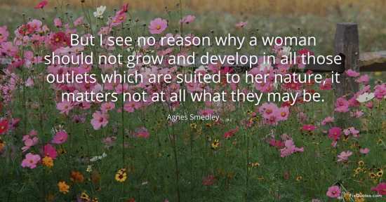 Smedley, Agnes. (2026, January 17). But I see no reason why a woman should not grow and develop in all those outlets which are suited to her nature, it matters not at all what they may be. FixQuotes. https://fixquotes.com/quotes/but-i-see-no-reason-why-a-woman-should-not-grow-35110/