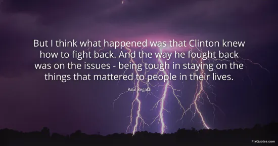 Begala, Paul. "But I think what happened was that Clinton knew how to fight back. And the way he fought back was on the issues - being tough in staying on the things that mattered to people in their lives." FixQuotes. January 17, 2026. https://fixquotes.com/quotes/but-i-think-what-happened-was-that-clinton-knew-57558/.