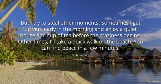 Crawford, Cindy. (2026, January 17). But I try to steal other moments. Sometimes I get up very early in the morning and enjoy a quiet house and cup of tea before the craziness begins. Other times, I'll take a quick walk on the beach. You can find peace in a few minutes. FixQuotes. https://fixquotes.com/quotes/but-i-try-to-steal-other-moments-sometimes-i-get-47516/