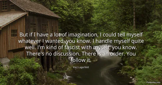 Lagerfeld, Karl. (2026, January 18). But if I have a lot of imagination, I could tell myself whatever I wanted, you know. I handle myself quite well. I'm kind of fascist with myself, you know. There's no discussion. There is an order. You follow it. FixQuotes. https://fixquotes.com/quotes/but-if-i-have-a-lot-of-imagination-i-could-tell-23266/