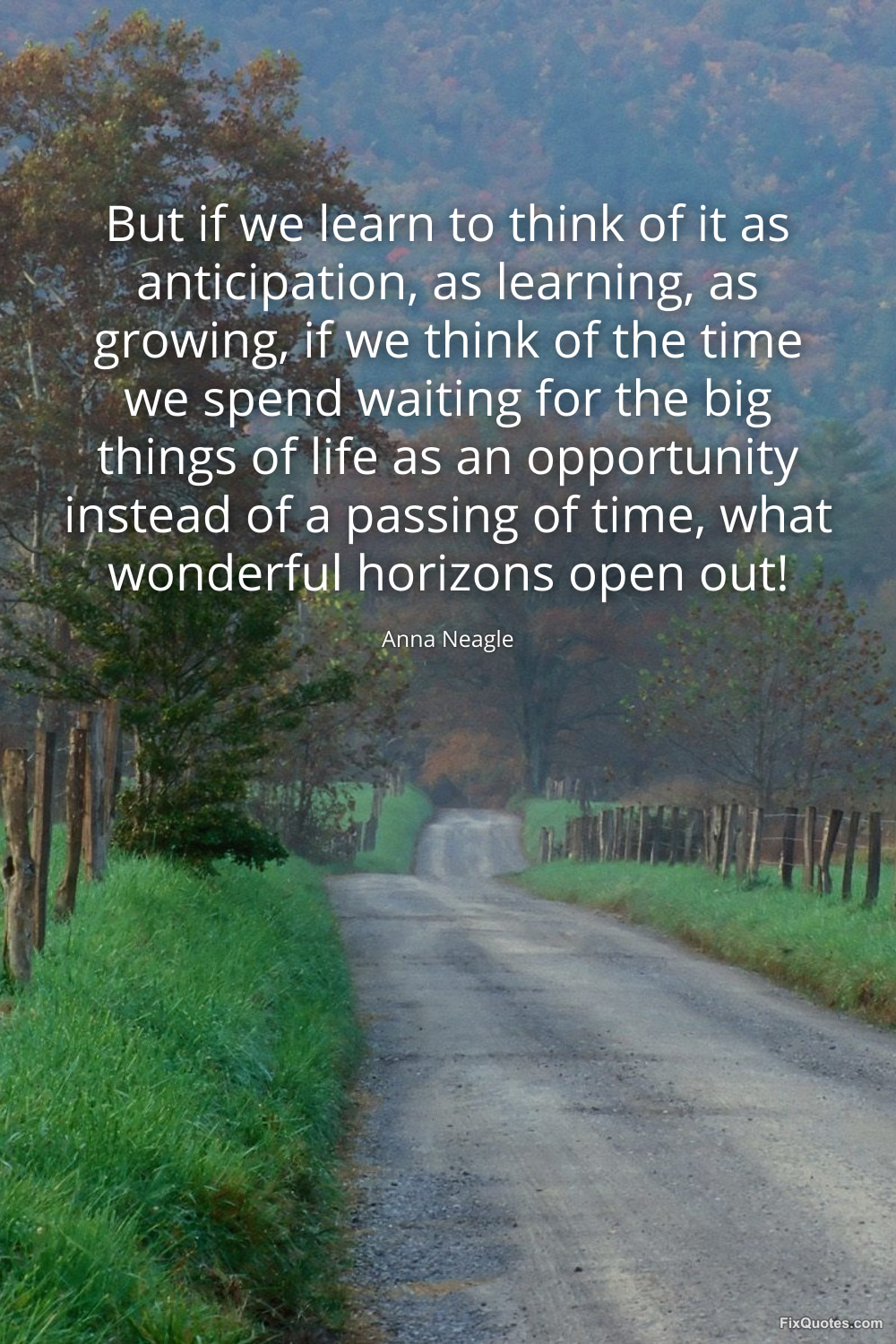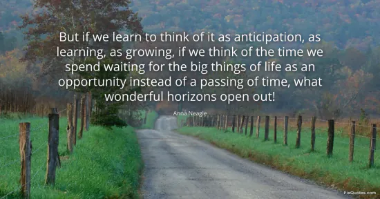 Neagle, Anna. "But if we learn to think of it as anticipation, as learning, as growing, if we think of the time we spend waiting for the big things of life as an opportunity instead of a passing of time, what wonderful horizons open out!" FixQuotes. January 15, 2026. https://fixquotes.com/quotes/but-if-we-learn-to-think-of-it-as-anticipation-as-140246/.