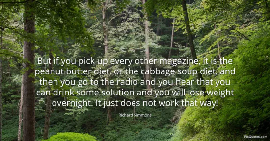 Simmons, Richard. "But if you pick up every other magazine, it is the peanut butter diet, or the cabbage soup diet, and then you go to the radio and you hear that you can drink some solution and you will lose weight overnight. It just does not work that way!" FixQuotes. January 15, 2026. https://fixquotes.com/quotes/but-if-you-pick-up-every-other-magazine-it-is-the-152031/.