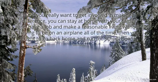 Bayh, Birch. "But if you really want to get involved in making a difference, you can stay at home with your family and have a job and make a reasonable living without having to be on an airplane all of the time, then you ought to go back home and run for School Board." FixQuotes. January 17, 2026. https://fixquotes.com/quotes/but-if-you-really-want-to-get-involved-in-making-50182/.