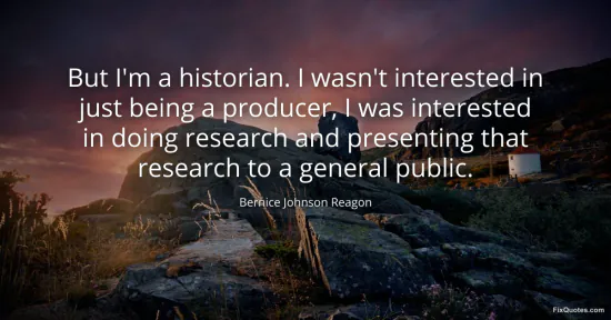 Reagon, Bernice Johnson. "But I'm a historian. I wasn't interested in just being a producer, I was interested in doing research and presenting that research to a general public." FixQuotes. January 17, 2026. https://fixquotes.com/quotes/but-im-a-historian-i-wasnt-interested-in-just-38678/.