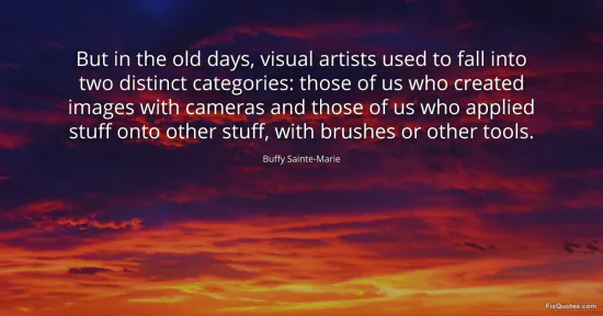 Sainte-Marie, Buffy. "But in the old days, visual artists used to fall into two distinct categories: those of us who created images with cameras and those of us who applied stuff onto other stuff, with brushes or other tools." FixQuotes. January 17, 2026. https://fixquotes.com/quotes/but-in-the-old-days-visual-artists-used-to-fall-39321/.