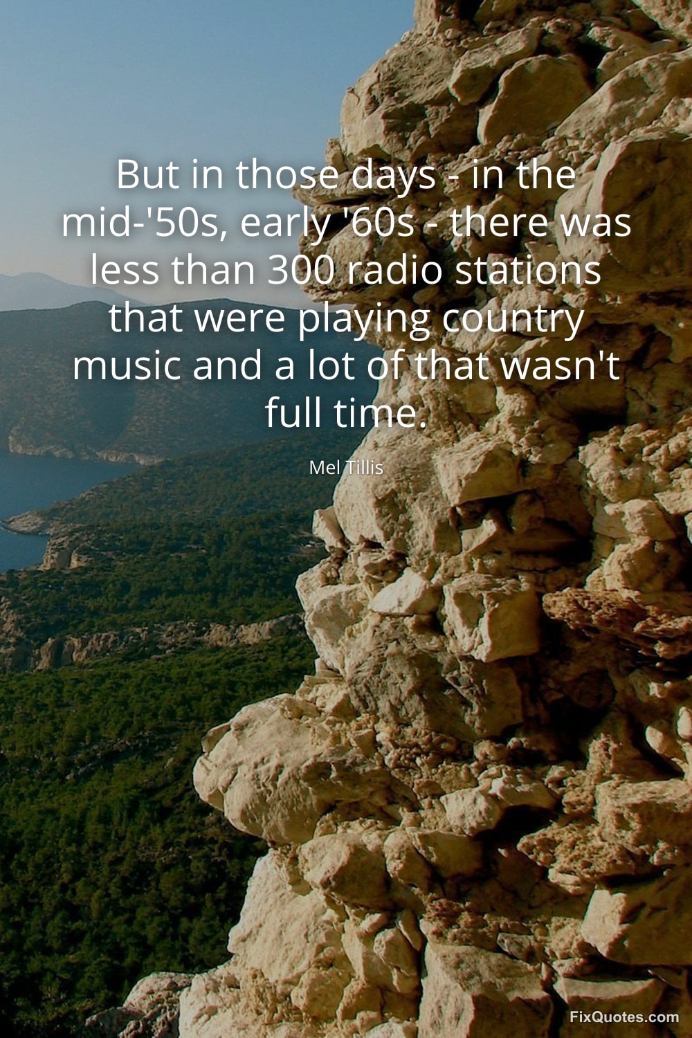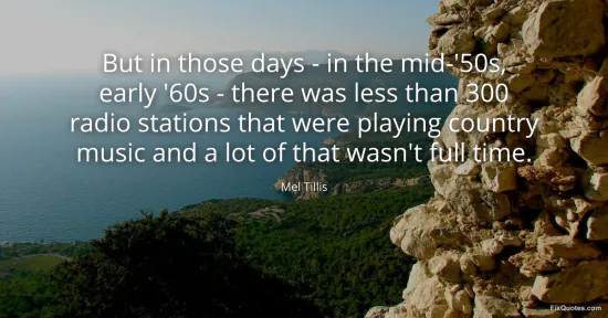 Tillis, Mel. "But in those days - in the mid-'50s, early '60s - there was less than 300 radio stations that were playing country music and a lot of that wasn't full time." FixQuotes. January 16, 2026. https://fixquotes.com/quotes/but-in-those-days-in-the-mid-50s-early-60s-82757/.