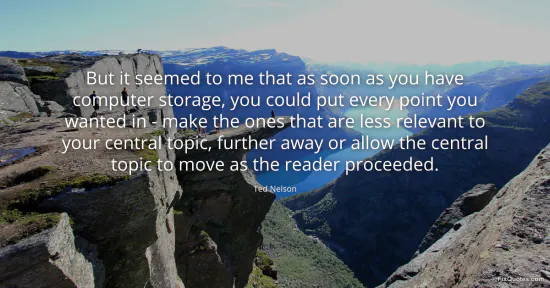 Nelson, Ted. (2026, February 18). But it seemed to me that as soon as you have computer storage, you could put every point you wanted in - make the ones that are less relevant to your central topic, further away or allow the central topic to move as the reader proceeded. FixQuotes. https://fixquotes.com/quotes/but-it-seemed-to-me-that-as-soon-as-you-have-63502/