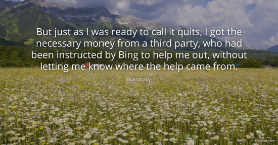 Crosby, Bob. (2026, January 16). But just as I was ready to call it quits, I got the necessary money from a third party, who had been instructed by Bing to help me out, without letting me know where the help came from. FixQuotes. https://fixquotes.com/quotes/but-just-as-i-was-ready-to-call-it-quits-i-got-85298/