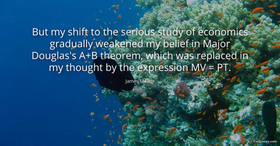 Meade, James. "But my shift to the serious study of economics gradually weakened my belief in Major Douglas's A+B theorem, which was replaced in my thought by the expression MV = PT." FixQuotes. January 18, 2026. https://fixquotes.com/quotes/but-my-shift-to-the-serious-study-of-economics-8132/.
