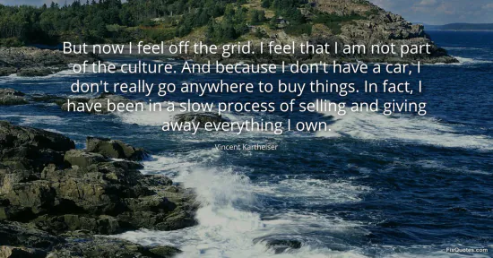 Kartheiser, Vincent. (2026, February 18). But now I feel off the grid. I feel that I am not part of the culture. And because I don't have a car, I don't really go anywhere to buy things. In fact, I have been in a slow process of selling and giving away everything I own. FixQuotes. https://fixquotes.com/quotes/but-now-i-feel-off-the-grid-i-feel-that-i-am-not-66200/
