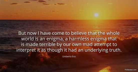 Eco, Umberto. "But now I have come to believe that the whole world is an enigma, a harmless enigma that is made terrible by our own mad attempt to interpret it as though it had an underlying truth." FixQuotes. February 23, 2026. https://fixquotes.com/quotes/but-now-i-have-come-to-believe-that-the-whole-90721/.