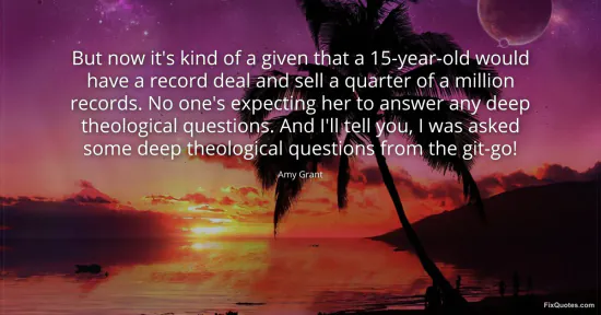 Grant, Amy. (2026, February 18). But now it's kind of a given that a 15-year-old would have a record deal and sell a quarter of a million records. No one's expecting her to answer any deep theological questions. And I'll tell you, I was asked some deep theological questions from the git-go! FixQuotes. https://fixquotes.com/quotes/but-now-its-kind-of-a-given-that-a-15-year-old-62481/