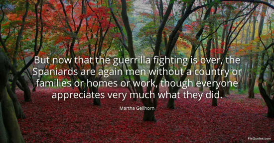 Gellhorn, Martha. "But now that the guerrilla fighting is over, the Spaniards are again men without a country or families or homes or work, though everyone appreciates very much what they did." FixQuotes. January 15, 2026. https://fixquotes.com/quotes/but-now-that-the-guerrilla-fighting-is-over-the-162444/.