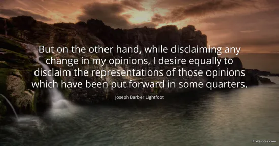 It’s the Victorian equivalent of a strategic sidestep: Lightfoot wants you to know he’s not backing down, but he’s also not going to let his opponents narrate him into heresy. The sentence is built like a legal brief disguised as pastoral politeness. “Disclaiming” does double duty, first as a declaration of steadfastness (“no change in my opinions”), then as a controlled detonation of the rumor mill (“disclaim the representations... put forward in some quarters”). He’s separating belief from branding.
