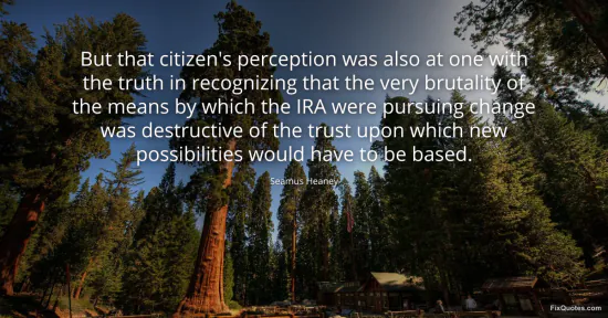 Heaney, Seamus. "But that citizen's perception was also at one with the truth in recognizing that the very brutality of the means by which the IRA were pursuing change was destructive of the trust upon which new possibilities would have to be based." FixQuotes. January 18, 2026. https://fixquotes.com/quotes/but-that-citizens-perception-was-also-at-one-with-11072/.