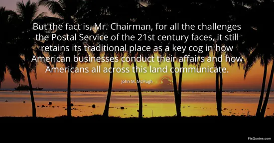 McHugh, John M. (2026, January 17). But the fact is, Mr. Chairman, for all the challenges the Postal Service of the 21st century faces, it still retains its traditional place as a key cog in how American businesses conduct their affairs and how Americans all across this land communicate. FixQuotes. https://fixquotes.com/quotes/but-the-fact-is-mr-chairman-for-all-the-71426/