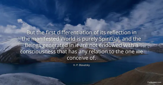 Blavatsky, H. P. "But the first differentiation of its reflection in the manifested World is purely Spiritual, and the Beings generated in it are not endowed with a consciousness that has any relation to the one we conceive of." FixQuotes. January 15, 2026. https://fixquotes.com/quotes/but-the-first-differentiation-of-its-reflection-148493/.