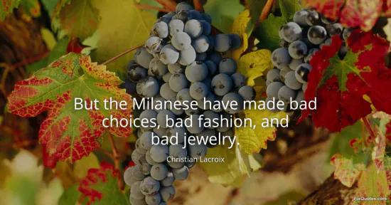 Lacroix, Christian. (2026, January 17). But the Milanese have made bad choices, bad fashion, and bad jewelry. FixQuotes. https://fixquotes.com/quotes/but-the-milanese-have-made-bad-choices-bad-46667/