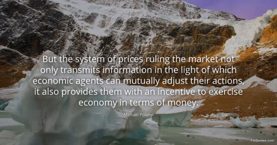 Polanyi, Michael. (2026, January 15). But the system of prices ruling the market not only transmits information in the light of which economic agents can mutually adjust their actions, it also provides them with an incentive to exercise economy in terms of money. FixQuotes. https://fixquotes.com/quotes/but-the-system-of-prices-ruling-the-market-not-51633/