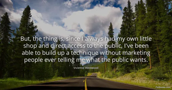 Westwood, Vivienne. (2026, January 18). But, the thing is, since I always had my own little shop and direct access to the public, I've been able to build up a technique without marketing people ever telling me what the public wants. FixQuotes. https://fixquotes.com/quotes/but-the-thing-is-since-i-always-had-my-own-little-23215/