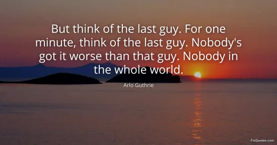 Guthrie, Arlo. (2026, January 15). But think of the last guy. For one minute, think of the last guy. Nobody's got it worse than that guy. Nobody in the whole world. FixQuotes. https://fixquotes.com/quotes/but-think-of-the-last-guy-for-one-minute-think-of-115352/
