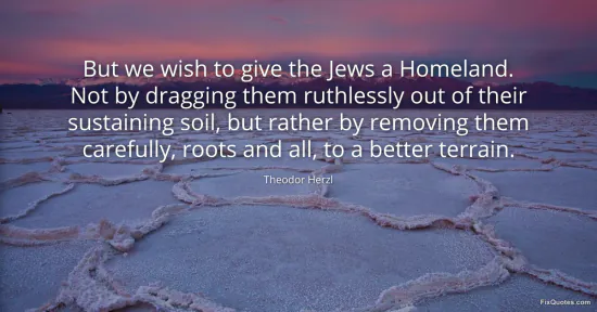 Herzl, Theodor. (2026, January 15). But we wish to give the Jews a Homeland. Not by dragging them ruthlessly out of their sustaining soil, but rather by removing them carefully, roots and all, to a better terrain. FixQuotes. https://fixquotes.com/quotes/but-we-wish-to-give-the-jews-a-homeland-not-by-113666/